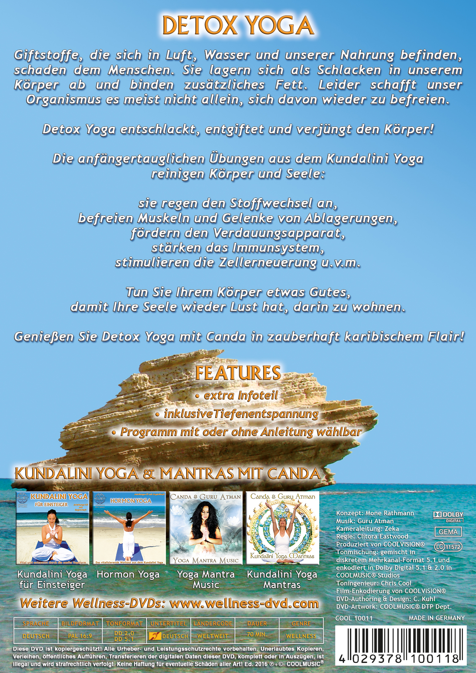 Detox Yoga entschlackt, entgiftet und verjüngt den Körper. Dieses Programm aus dem Kundalini Yoga widmet sich speziell der natürlichen Entschlackung und Entgiftung. Der Vorteil: es gibt keine unerwünschten Nebenwirkungen wie beispielsweise bei kommerziellen Detox-Produkten. Denn die ursprünglichen Übungen aus dem Kundalini Yoga üben einen natürlichen Druck auf bestimmte Organe aus und bewirken eine wirksame innere Massage. Die Durchblutung und der Stoffwechsel vieler Organe wird angeregt. Der Körper steigert seine Sauerstoffaufnahme und schwemmt vermehrt Gifte aus dem Körper. Muskeln und Gelenke werden von vielen Ablagerungen wie Kalziumkristallen entschlackt. Die Darmperistaltik und die Tätigkeit der übrigen Verdauungsorgane wird gefördert.