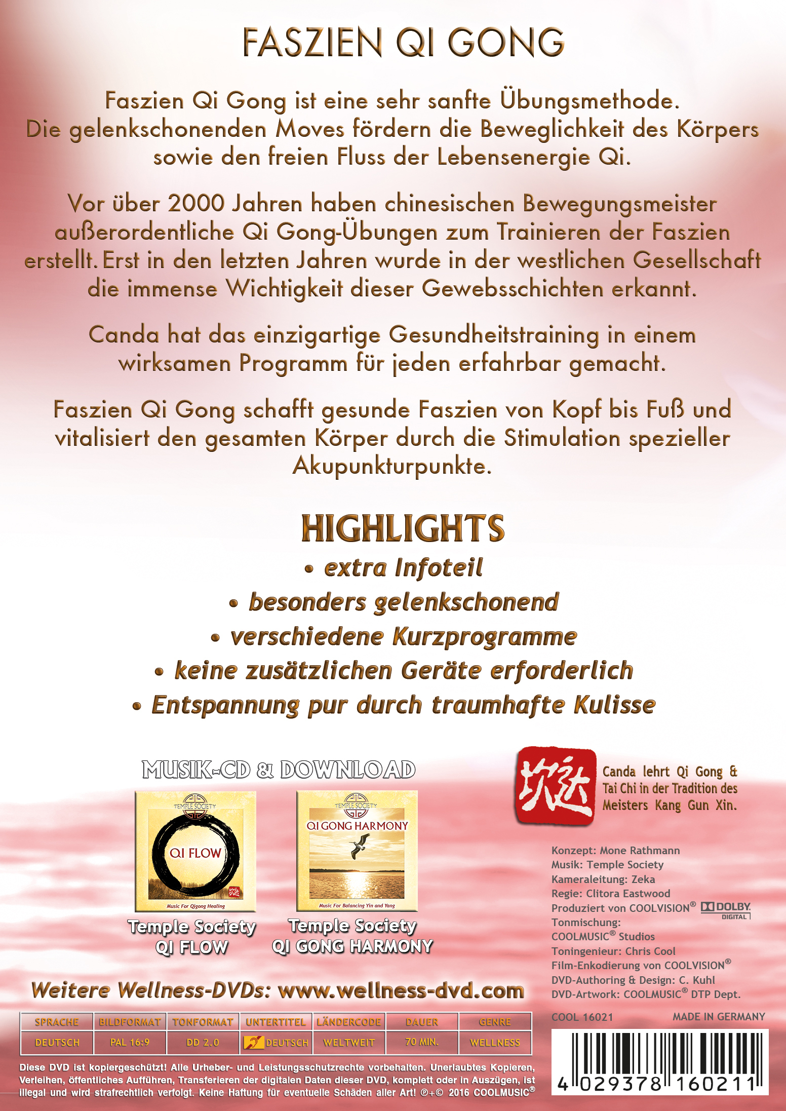 Vor über 2000 Jahren haben chinesischen Bewegungsmeister außerordentliche Qi Gong-Übungen zum Trainieren der Faszien erstellt. Erst in den letzten Jahren wurde in der westlichen Gesellschaft die immense Wichtigkeit dieser Gewebsschichten erkannt. Canda hat das einzigartige Gesundheitstraining in einem wirksamen Programm für jeden erfahrbar gemacht.