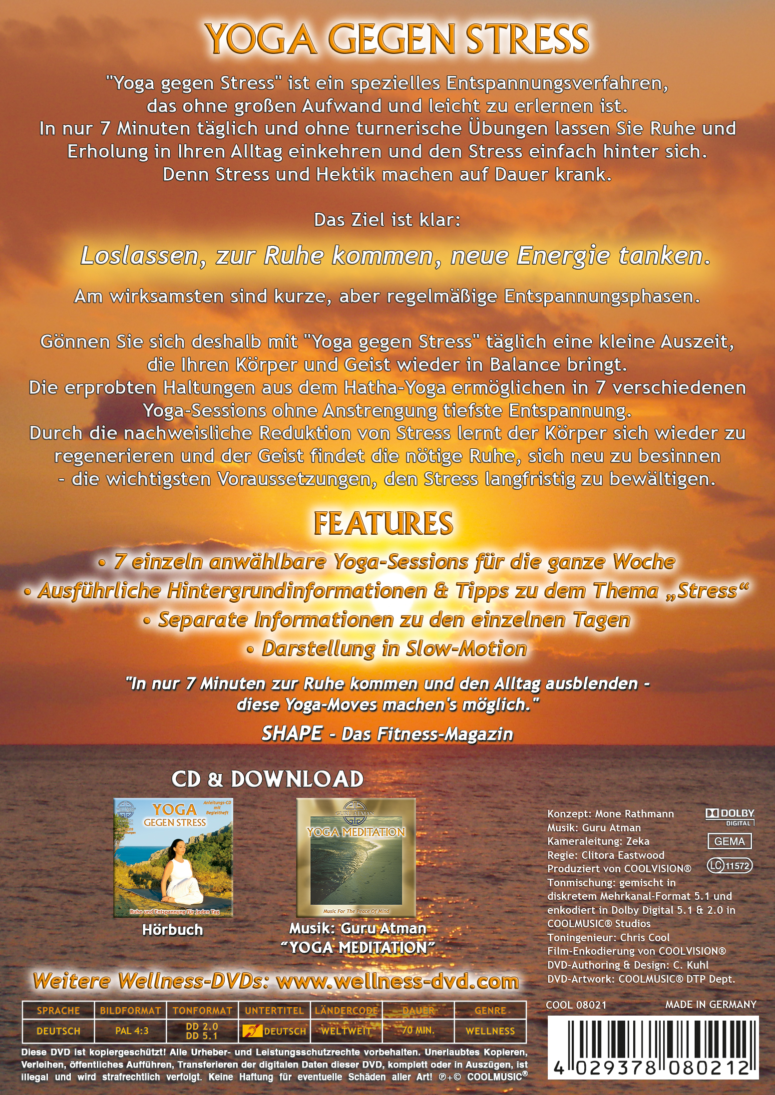 "Yoga gegen Stress" ist ein spezielles Entspannungsverfahren, das ohne großen Aufwand und leicht zu erlernen ist. In nur 7 Minuten täglich und ohne turnerische Übungen lassen Sie Ruhe und Erholung in Ihren Alltag einkehren und den Stress einfach hinter sich. Denn Stress und Hektik machen auf Dauer krank.