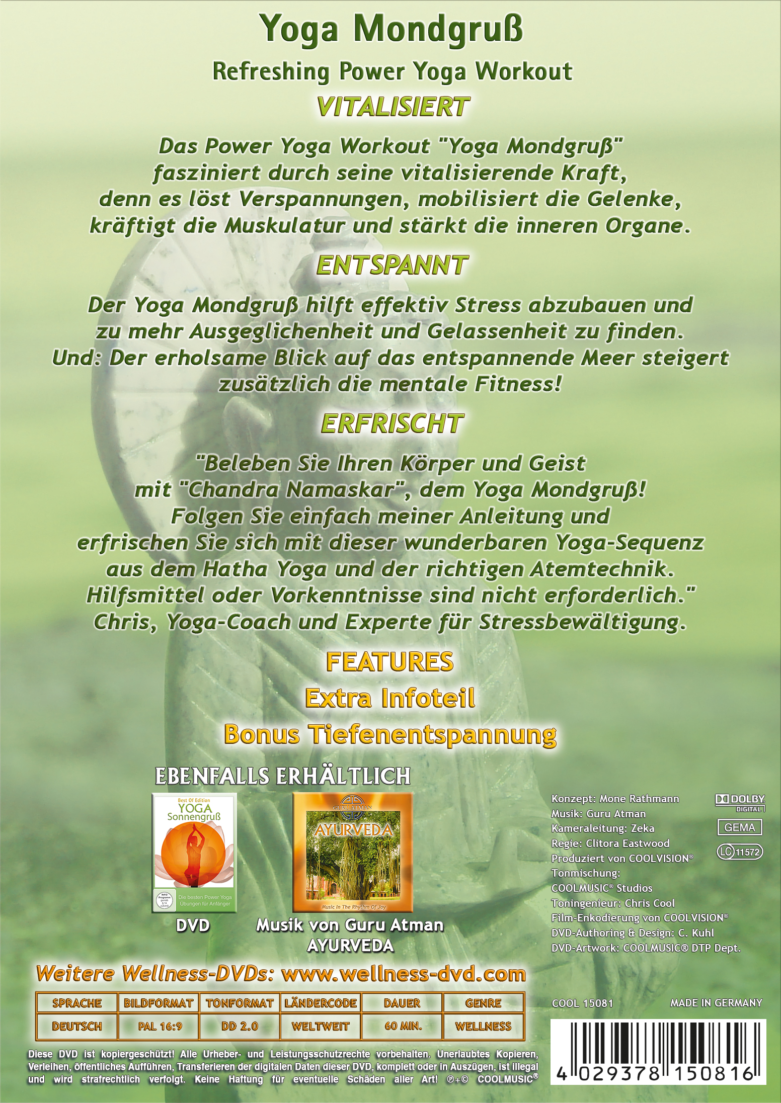 "Beleben Sie Ihren Körper und Geist mit "Chandra Namaskar", dem Yoga Mondgruß! Folgen Sie einfach meiner Anleitung und erfrischen Sie sich mit dieser wunderbaren Yoga-Sequenz aus dem Hatha Yoga und der richtigen Atemtechnik. Hilfsmittel oder Vorkenntnisse sind nicht erforderlich." Chris, Yoga-Coach und Experte für aktive und passive Stressbewältigung.