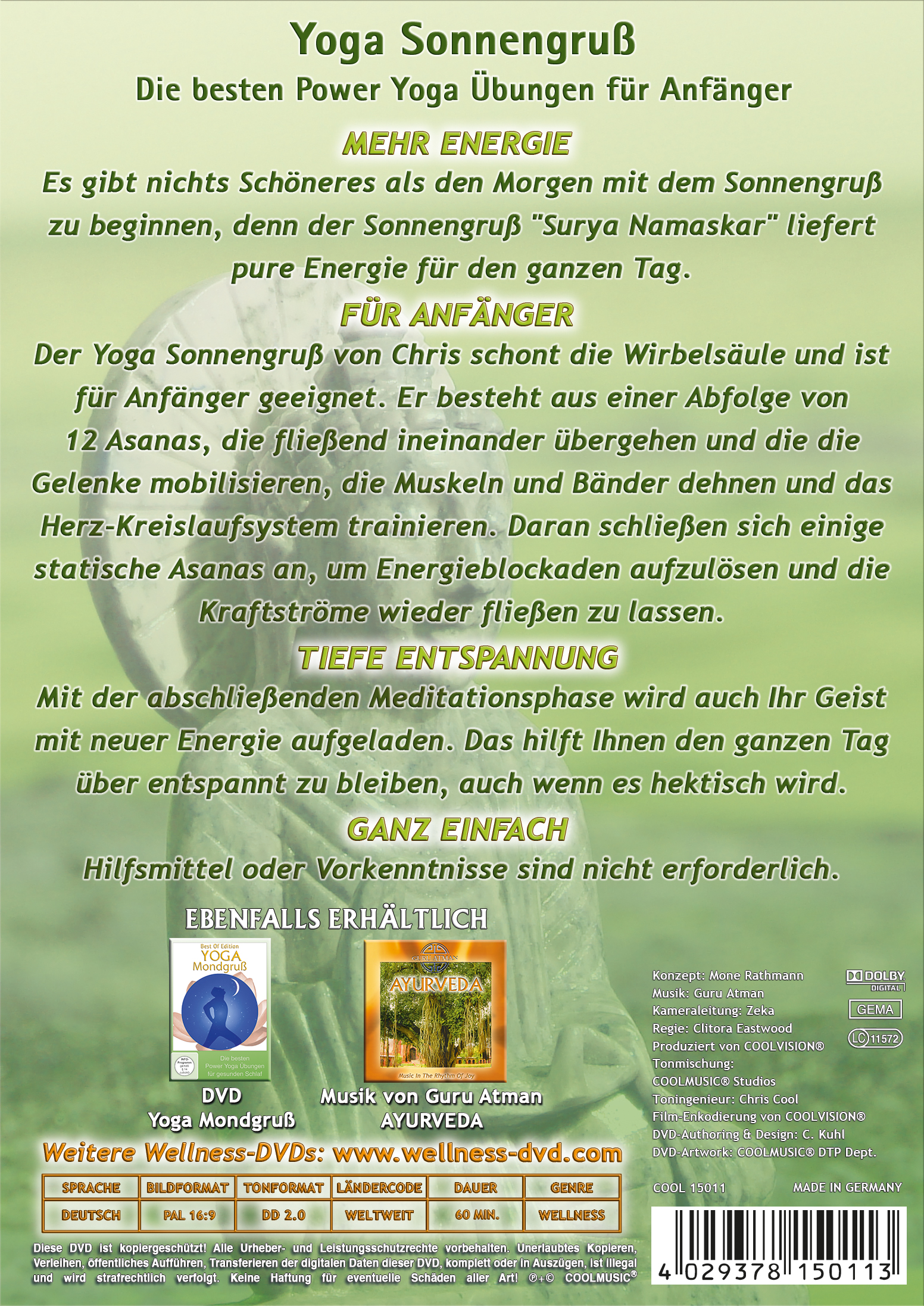 Der Yoga Sonnengruß von Chris schont die Wirbelsäule und ist für Anfänger geeignet. Er besteht aus einer Abfolge von 12 Asanas, die fließend ineinander übergehen und die die Gelenke mobilisieren, die Muskeln und Bänder dehnen und das Herz-Kreislaufsystem trainieren. Daran schließen sich einige statische Asanas an, um Energieblockaden aufzulösen und die Kraftströme wieder fließen zu lassen. Mit der abschließenden Meditationsphase wird auch Ihr Geist mit neuer Energie aufgeladen. Das hilft Ihnen den ganzen Tag über entspannt zu bleiben, auch wenn es hektisch wird.